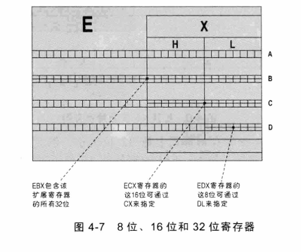 EAX,EBX,ECX,EDX就要稍微特别一点,他们的低16位还被分为2个8位
