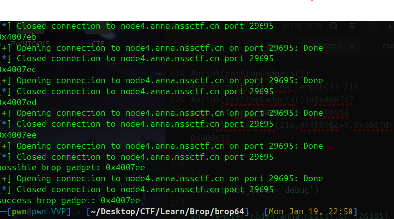 目的是测试当前找到的gadgets是否可用,如果把stop gadegets放在测试gadgets后面,从测试gadgets ret到stop gadgets时就会保持连接,说明该gadgets可用,否则不可用